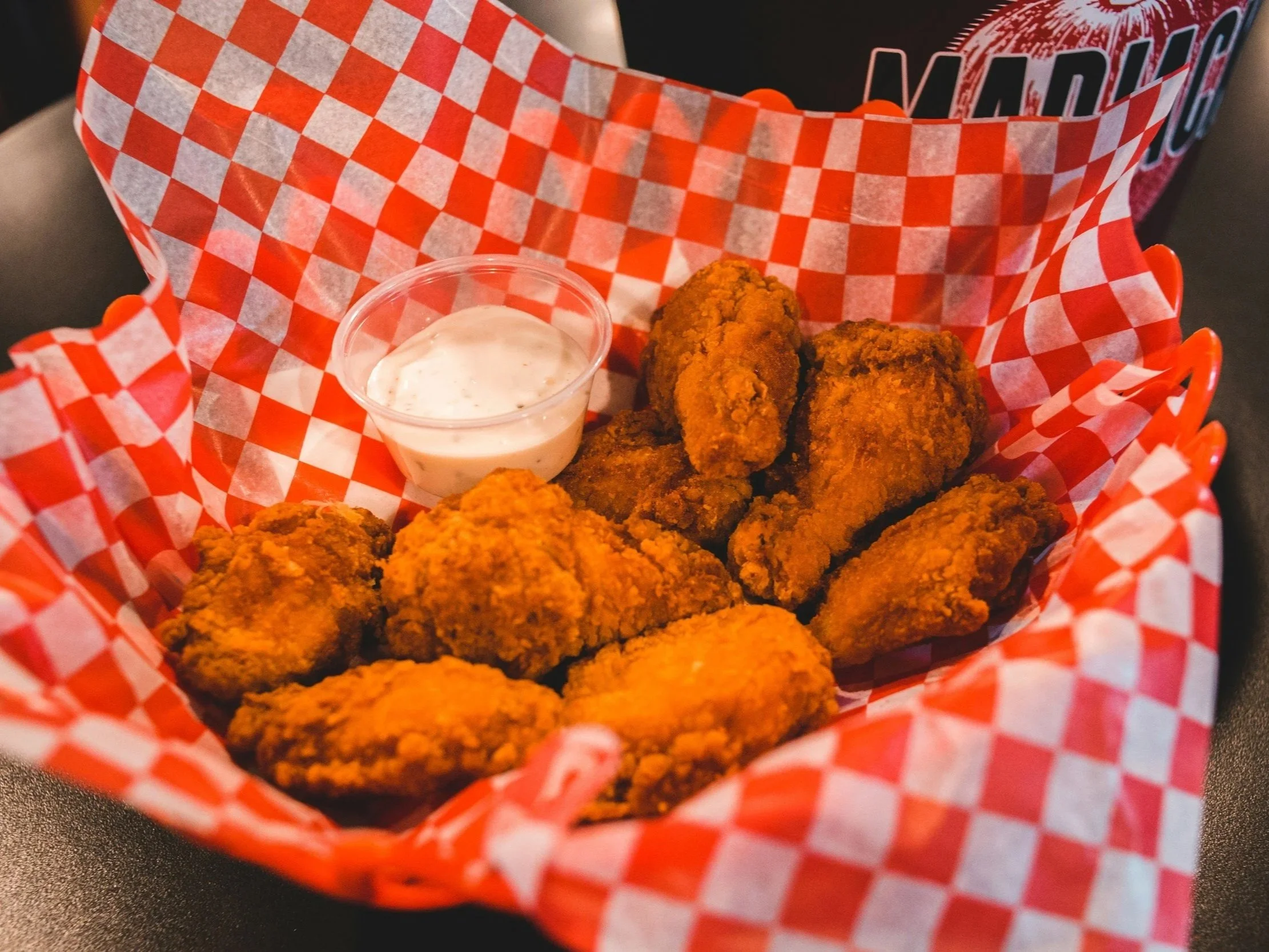 Ten pieces of our popular ‘naked’ chicken wings, served with your choice of dip: honey garlic, honey mustard, hot, BBQ and many more flavours. $12.95